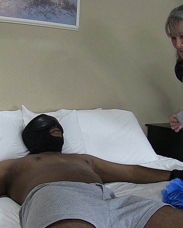 Maid walks into room she was told not to clean and discovers a slave bound to the bed with mask on, tape over his mouth and blindfolded. The maid is a bit confused but quickly learns what type of slave he is. She has a bit of fun with him before finishing her chores elsewhere in the house.